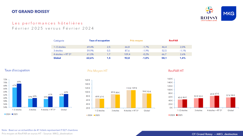 En février 2025, le secteur hôtelier du Grand Roissy continue sa trajectoire de reprise, avec une amélioration mesurée mais constante des principaux indicateurs de performance. Comparativement à février 2023, les données confirment une dynamique de croissance, malgré quelques disparités entre zones géographiques et gammes hôtelières.