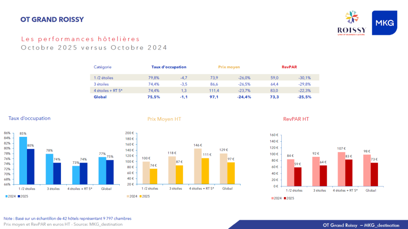 En octobre 2025, les hôtels du Grand Roissy enregistrent un taux d’occupation global de 75,5 %, en léger retrait de -1,1 point par rapport à octobre 2024. Si la fréquentation reste relativement résiliente, la situation est nettement plus dégradée sur le plan tarifaire.