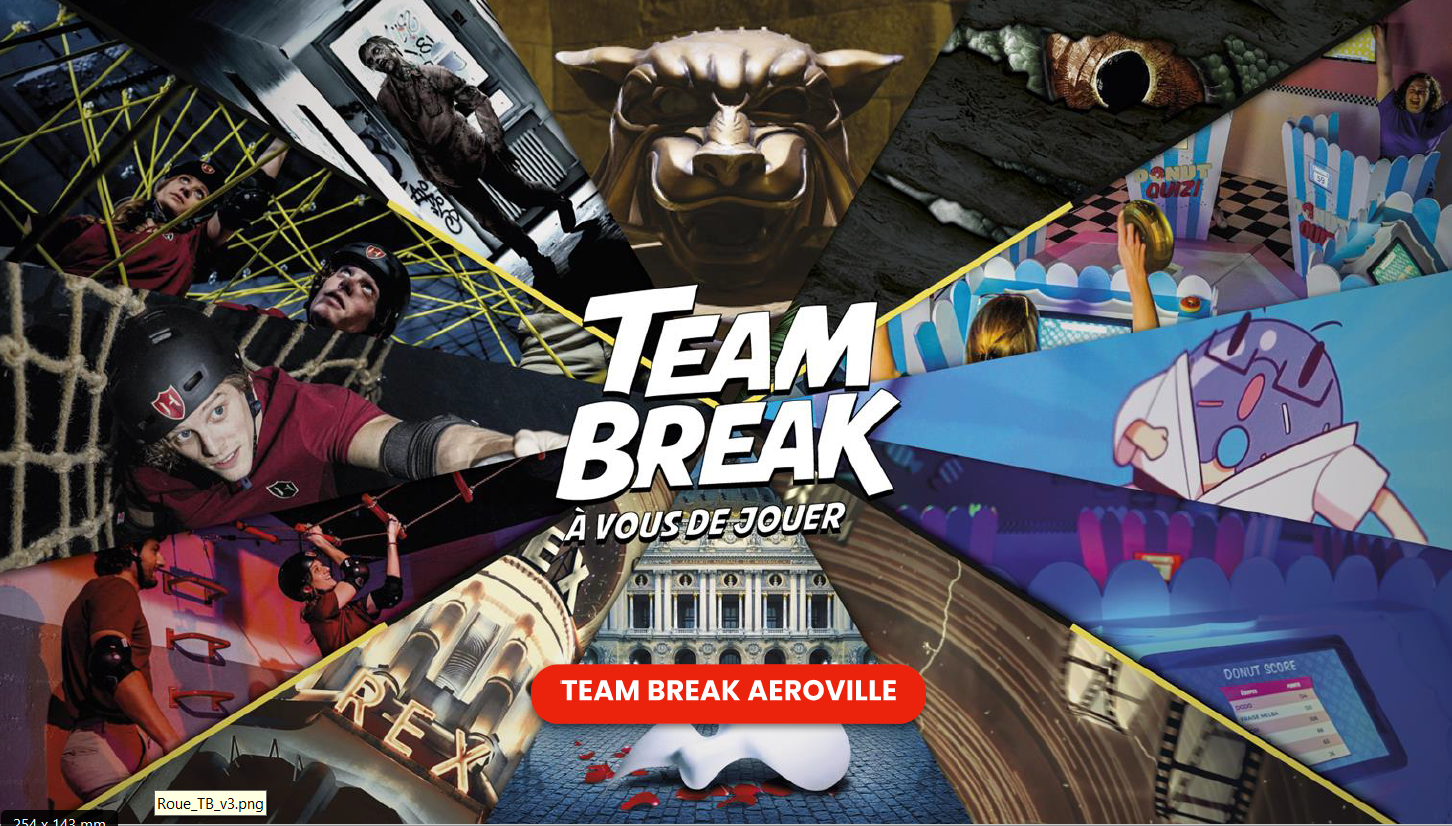 • Team Break Aéroville à Roissy-en-France (95) : Escape games et missions immersives à thèmes. Choisissez entre : Ford Boyard, Magic School, Walking Dead, Donut Quizz et bien d’autres.