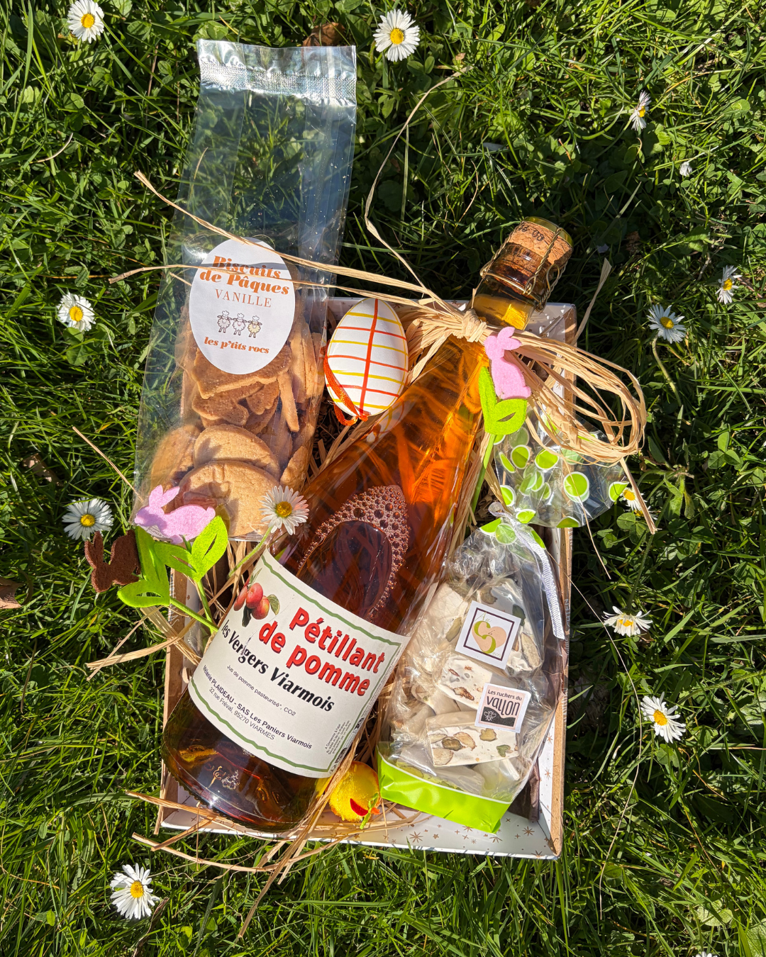 Nougat nature de chez Les Ruchers du Vallon & Au Cœur du Sucre, jus de pomme pétillant de chez Les Vergers Viarmois, et biscuit de Pâques vanille de chez Les P’tits Rocs.