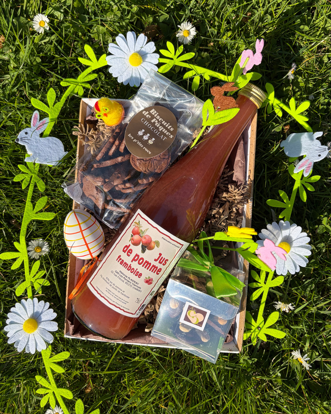 Mini mendiants de chez Au Cœur du Sucre, jus de pomme framboise de chez Les Vergers Viarmois et biscuit de Pâques au chocolat de chez Les P’tits Rocs.