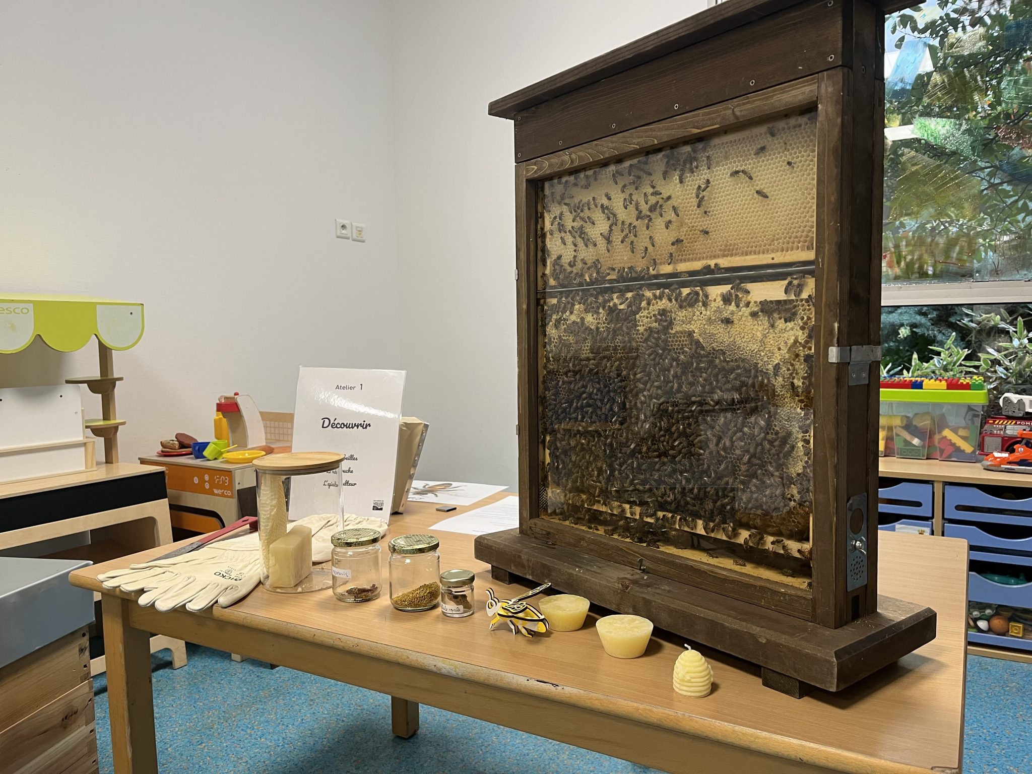 - Le monde de la ruche : Observation sécurisée et explication de l’organisation sociale des abeilles (reine, ouvrières, faux-bourdons).