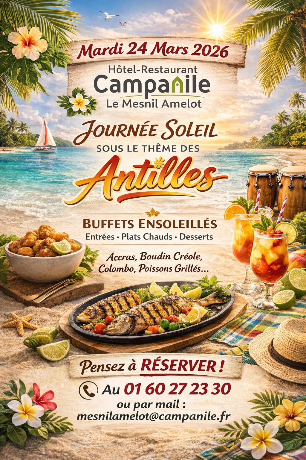 Évadez-vous au Campanile du Mesnil Amelot pour une "Journée Soleil" aux saveurs des Antilles ! Profitez de buffets ensoleillés avec accras, boudin créole et colombo. Un rendez-vous gourmand et convivial à ne pas manquer le 24 mars 2026.